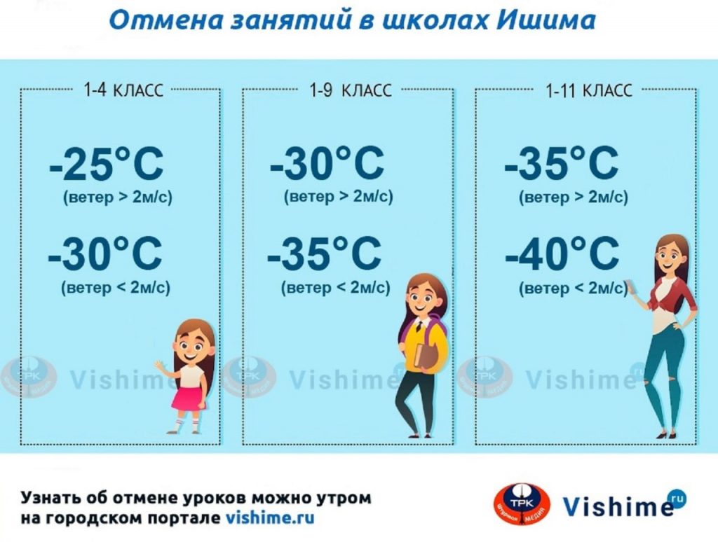 Информация об отмене занятий будет размещаться в актированный день дважды (не позднее 6:30 для первой смены, 11:00 – для второй) в группе ВКонтакте Ишимского городского методического центра (vk.com/public209105883). Новость в ленте будут сопровождать тематические картинки из карусели.